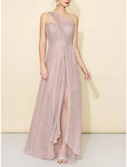 Wholesa A-Line Bridesmaid Dress One Shoulder Sleeveless Elegant Sweep / Brush Train Sequined with Split Front / Ruching
