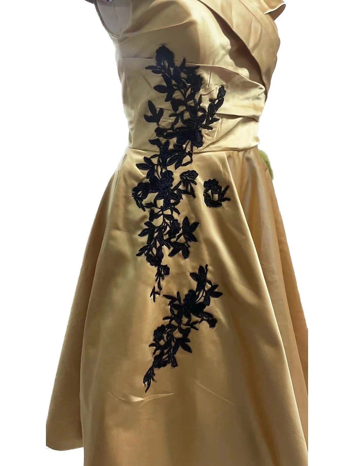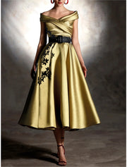 Wholesa A-Line Cocktail Dresses Elegant Dress Formal Wedding Guest Tea Length Sleeveless Off Shoulder Satin with Pleats Appliques - US 2 / UK 6 / EU 32
