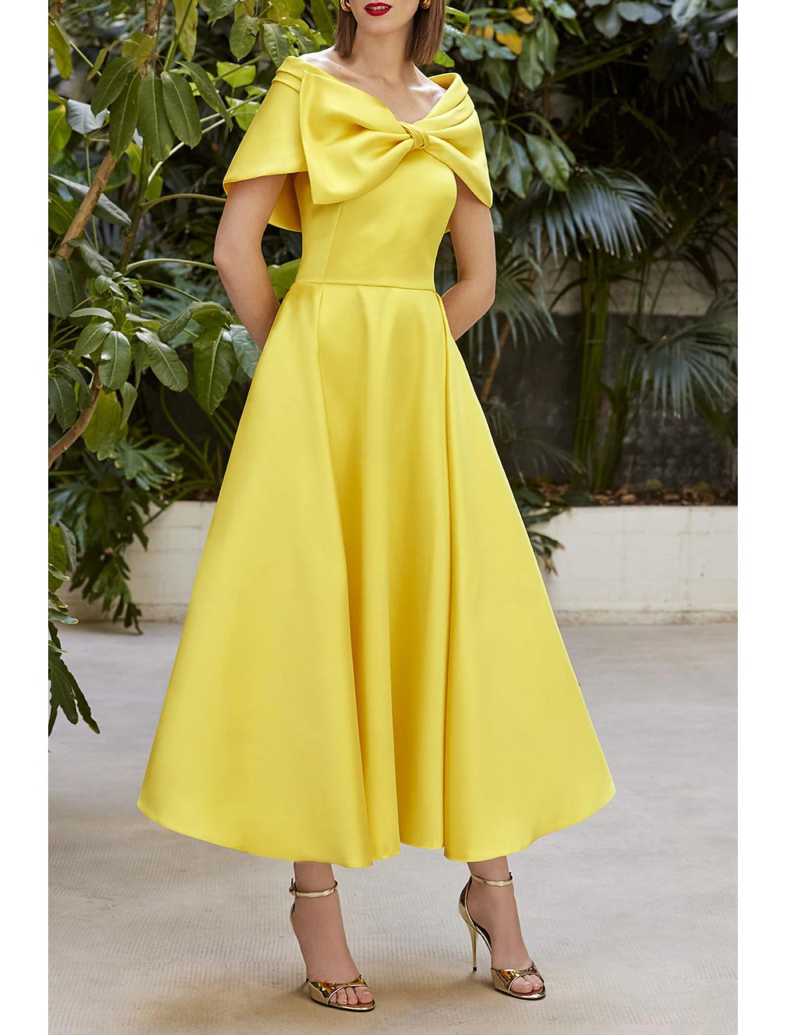 Wholesa A-Line Cocktail Dresses Elegant Dress Wedding Cocktail Party Tea Length Short Sleeve Off Shoulder Italy Satin with Bow(s) - US 2 / UK 6 / EU 32