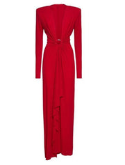 Wholesa Sheath / Column Evening Gown Elegant Dress Formal Ankle Length Christmas Red Green Dress Long Sleeve V Neck Stretch Chiffon with Pleats Slit - Red / US 2 / UK 6 / EU 32