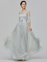 Wholesa A-Line Empire Dress Wedding Guest Prom Floor Length Half Sleeve Illusion Neck Tulle with Bow(s) Appliques