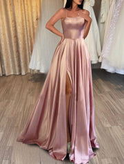 Wholesa A-Line Evening Gown Backless Dress Formal Wedding Guest Sweep / Brush Train Sleeveless Spaghetti Strap Satin Backless with Slit