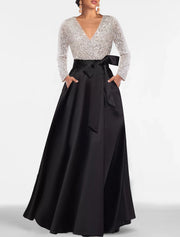 Wholesa A-Line Evening Gown Elegant Dress Formal Floor Length Long Sleeve V Neck Fall Wedding Guest Satin with Sequin Pocket - US 2 / UK 6 / EU 32
