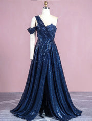 Wholesa A-Line Evening Gown Elegant Dress Formal Floor Length Sleeveless One Shoulder Sequined with Glitter Slit Appliques