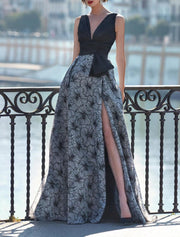Wholesa A-Line Evening Gown Elegant Dress Masquerade Prom Floor Length Sleeveless V Neck Satin with Slit Embroidery
