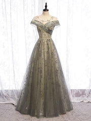 Wholesa A-Line Evening Gown Elegant Dress Wedding Guest Floor Length Short Sleeve Illusion Neck Tulle with Pleats - US 2 / UK 6 / EU 32