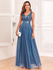 Wholesa A-Line Evening Gown Empire Dress Evening Party Prom Floor Length Sleeveless V Neck Belt / Sash Tulle V Back with Glitter Embroidery