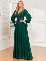 Wholesa A-Line Evening Gown Empire Dress Evening Party Wedding Reception Floor Length Long Sleeve V Neck Fall Wedding Guest Chiffon V Back with Sequin