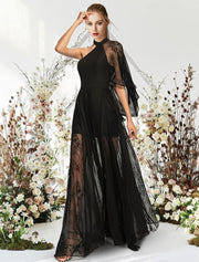 Wholesa A-Line Evening Gown Empire Dress Wedding Guest Prom Floor Length Half Sleeve One Shoulder Lace with Pleats - US 2 / UK 6 / EU 32