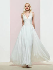 Wholesa A-Line Evening Gown Open Back Dress Wedding Party Birthday Floor Length Sleeveless V Neck Chiffon with Appliques