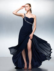 Wholesa A-Line Furcal Dress Prom Formal Evening Sweep / Brush Train Sleeveless One Shoulder Chiffon with Criss Cross Pearls Crystals