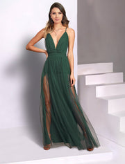 Wholesa A-Line Wedding Guest Dresses Open Back Dress Party Wear Wedding Party Floor Length Sleeveless Spaghetti Strap Bridesmaid Dress Tulle with Pleats