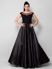 Wholesa Ball Gown Minimalist Formal Evening Dress Illusion Neck Short Sleeve Floor Length Stretch Satin with Beading Appliques - US 2 / UK 6 / EU 32
