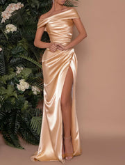 Wholesa Mermaid Party Dress Evening Gown Sexy Dress Formal Wedding Guest Sweep / Brush Train Sleeveless Off Shoulder Satin with Ruched Slit
