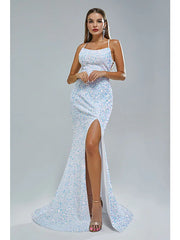 Wholesa Mermaid / Trumpet Evening Gown Elegant Dress Party Wear Court Train Sleeveless Spaghetti Strap Lace Crisscross Back with Sequin Slit - As picture1 / US 2 / UK 6 / EU 32