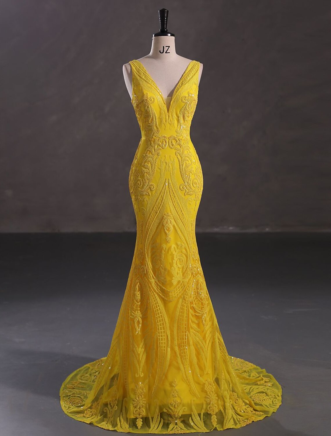Wholesa Mermaid / Trumpet Evening Gown Sparkle & Shine Dress Engagement Formal Evening Court Train Sleeveless V Neck Sequined with Sequin
