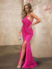 Wholesa Sexy Prom Dresses Sparkle & Shine High Split Formal Evening Dress Mermaid One Shoulder Sleeveless Sweep / Brush Train Sequined with Sequin