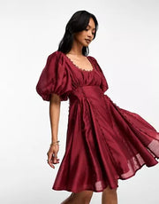 Wholesa square neck lace insert mini dress with puff sleeves in red