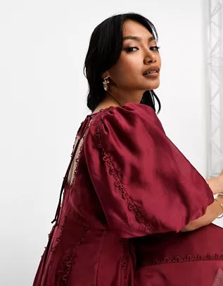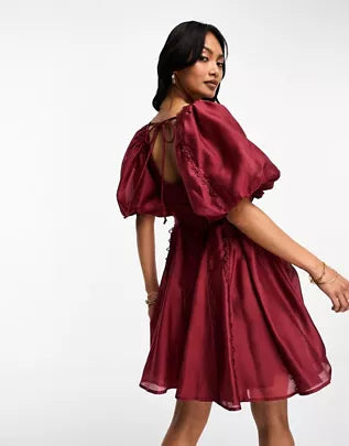 Wholesa square neck lace insert mini dress with puff sleeves in red - US 2 / UK 6 / EU 32