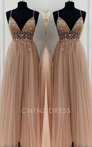 Wholesa A-Line/Elegant Spaghetti Straps Sleeveless Beading Tulle Floor-Length formal dresses Bridesmaid Dresses evening gown Prom Dress With Split