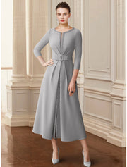 Wholesa A-Line Mother of the Bride Dress Wedding Guest Elegant Scoop Neck Tea Length Stretch Chiffon 3/4 Length Sleeve with Bow(s) Sequin Ruching