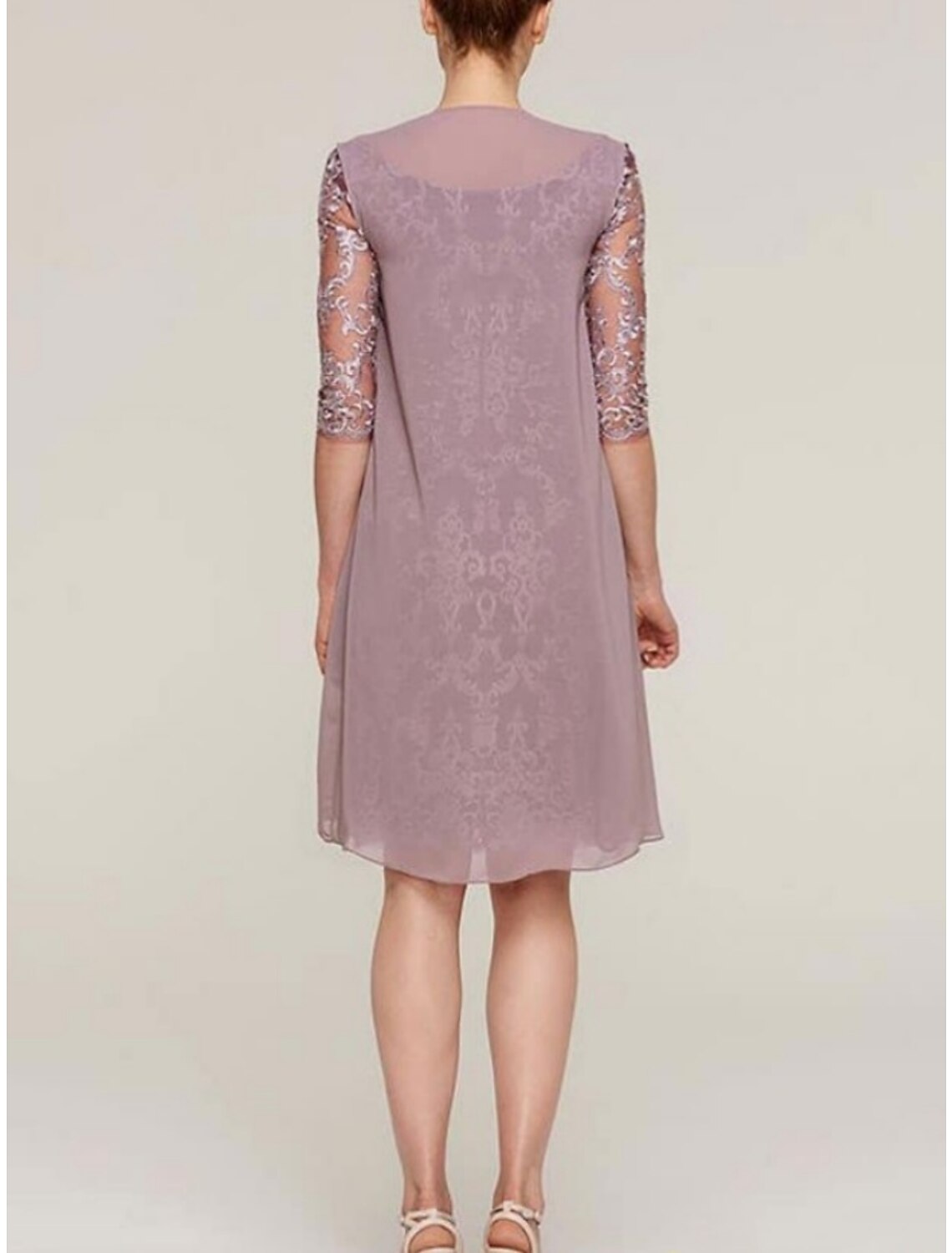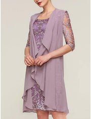 Wholesa  Two Piece Sheath / Column Mother of the Bride Dress Wedding Guest Elegant Petite Scoop Neck Knee Length Chiffon Half Sleeve with Lace Ruching