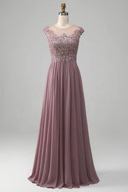 Wholesa A-line Beaded Chiffon Round Neck Maxi Mother of the Bride Dress