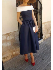 Wholesa A-Line Mother of the Bride Dress Wedding Guest Elegant Off Shoulder Tea Length Taffeta Short Sleeve with Color Block - US 2 / UK 6 / EU 32