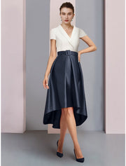 Wholesa A-Line Mother of the Bride Dress Wedding Guest Elegant Petite V Neck Asymmetrical Satin Short Sleeve with Ruching - US 2 / UK 6 / EU 32
