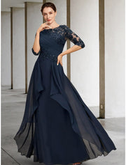 Wholesa A-Line Mother of the Bride Dress Wedding Guest Elegant Scoop Neck Floor Length Chiffon Lace Half Sleeve with Sequin Ruching Solid Color