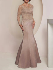 Wholesa Mermaid / Trumpet Mother of the Bride Dress Wedding Guest Elegant Party Jewel Neck Floor Length Imitated Silk Long Sleeve with Lace Pleats