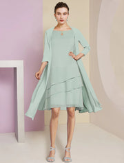 Wholesa Two Piece A-Line Mother of the Bride Dress Formal Wedding Guest Elegant Scoop Neck Knee Length Chiffon 3/4 Length Sleeve with Tier