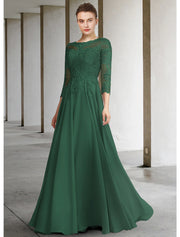 wholesale  A-Line Mother of the Bride Dress Elegant Jewel Neck Floor Length Chiffon Lace 3/4 Length Sleeve with Pleats Appliques