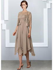 wholesale A-Line Mother of the Bride Dress Elegant Jewel Neck Tea Length Chiffon Lace Half Sleeve with Pleats - US 2 / UK 6 / EU 32