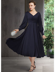 wholesale A-Line Mother of the Bride Dress Elegant V Neck Tea Length Chiffon Short Sleeve Long Sleeve with Pleats Ruching - US 2 / UK 6 / EU 32