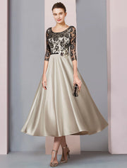 wholesale A-Line Mother of the Bride Dress Formal Church Party Elegant Scoop Neck Tea Length Satin Lace Half Sleeve with Flower Color Block - US 2 / UK 6 / EU 32