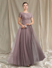 wholesale A-Line Mother of the Bride Dress Luxurious Elegant Jewel Neck Floor Length Lace Tulle Short Sleeve with Pleats Appliques - US 2 / UK 6 / EU 32