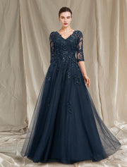 wholesale  A-Line Mother of the Bride Dress Luxurious Elegant V Neck Floor Length Chiffon Lace Tulle Half Sleeve with Sequin Appliques