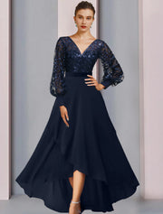 wholesale A-Line Mother of the Bride Dress Wedding Guest Sparkle & Shine High Low Jewel Neck Asymmetrical Tea Length Chiffon Lace Sequined Long Sleeve with Sequin Appliques Fall