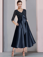 wholesale   A-Line Mother of the Bride Dress Wedding Guest Vintage Elegant V Neck Tea Length Satin Lace 3/4 Length Sleeve with Bow(s) Pleats Sequin