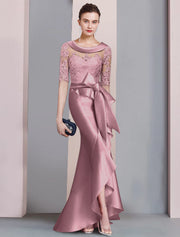 wholesale   Mermaid / Trumpet Mother of the Bride Dress Formal Fall Wedding Guest Dresses Elegant High Low Scoop Neck Sweep / Brush Train Asymmetrical Satin Lace Half Sleeve with Bow(s) Appliques