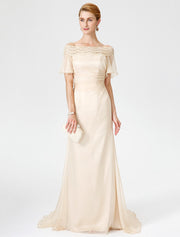 wholesale  Sheath / Column Mother of the Bride Dress Elegant Off Shoulder Sweep / Brush Train Chiffon Lace Short Sleeve with Pleats