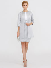 wholesale  Sheath / Column Mother of the Bride Dress Formal Two Piece Jewel Neck Short / Mini Satin Short Sleeve yes with Lace Pleats