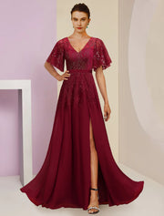 wholesale  Sheath / Column Mother of the Bride Dress Wedding Guest Elegant Sparkle & Shine V Neck Floor Length Chiffon Lace Sequined Short Sleeve with Pleats Split Front