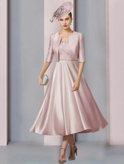 wholesale Two Piece A-Line Mother of the Bride Dress Wedding Guest Church Party Elegant Scoop Neck Tea Length Satin Lace Half Sleeve with Pleats - US 2 / UK 6 / EU 32
