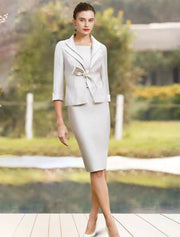 wholesale  Two Piece Sheath / Column Mother of the Bride Dress Church Elegant Jewel Neck Knee Length Satin Sleeveless Short Jacket Dresses with Bow(s) Ruffles Side-Draped