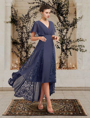 wholesale A-Line Mother of the Bride Dress Plus Size Elegant High Low V Neck Asymmetrical Chiffon Lace Short Sleeve with Pleats Appliques - US 2 / UK 6 / EU 32