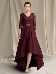 wholesale A-Line Mother of the Bride Dress Plus Size Elegant High Low V Neck Asymmetrical Floor Length Chiffon Lace 3/4 Length Sleeve with Pleats Appliques Crystal Brooch
