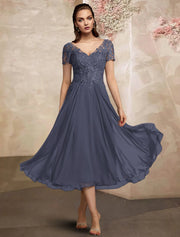 wholesale A-Line Mother of the Bride Dress Plus Size Elegant V Neck Tea Length Chiffon Lace Short Sleeve with Pleats Appliques - StormyPetal / US 2 / UK 6 / EU 32