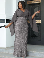 wholesale Mermaid / Trumpet Wedding Guest Dresses Plus Size Dress Cocktail Party Dress Black Tie Floor Length Long Sleeve V Neck Fall Wedding Guest Sequined with Glitter Slit